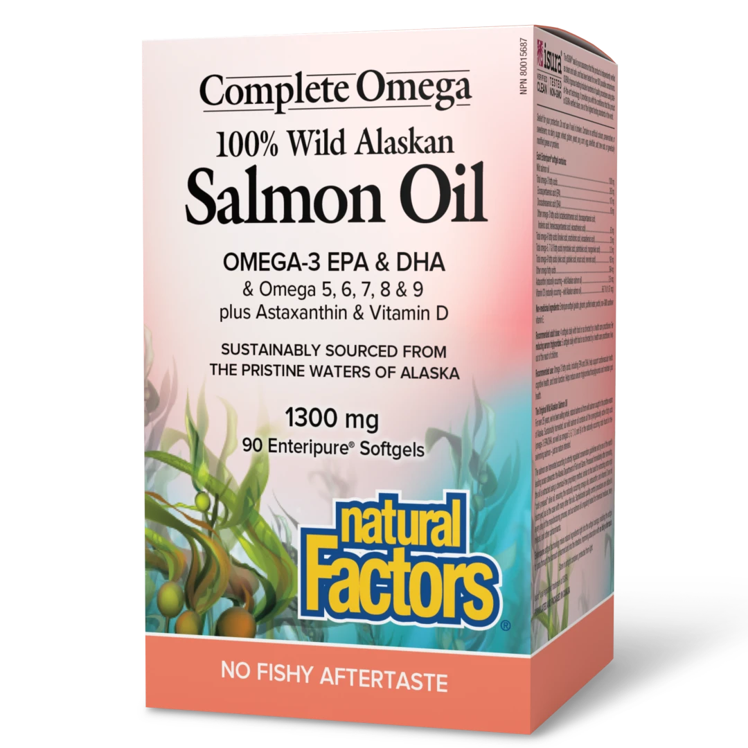 Natural Factors was the first Canadian company to offer whole, natural salmon oil from wild-caught Alaskan salmon, and has been doing so for over 25 years. Complete Omega 100% Wild Alaskan Salmon Oil provides the full spectrum of synergistic omega fatty acids, as well as naturally occurring astaxanthin and vitamin D. Each clear enteric softgel delivers 1300 mg of sustainably sourced wild salmon oil, with no fishy aftertaste.